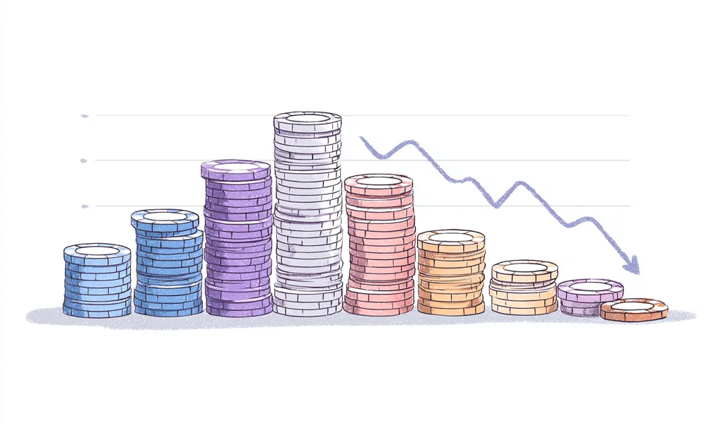 The compounding effect creates asymmetric risk. A 30% price drop requires a 43% price recovery to restore original value (e.g., $10,000 → $7,000 → $10,000). During the recovery period, your effective buy-in count decreases, forcing stake adjustments or increased bust-out risk. If you’re rolled for $2/$5 with 25 buy-ins ($12,500 in BTC) and BTC drops 35%, you now hold 16 buy-ins—requiring a move down to $1/$2 despite unchanged poker performance.