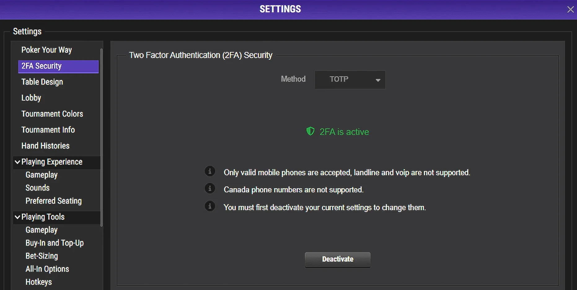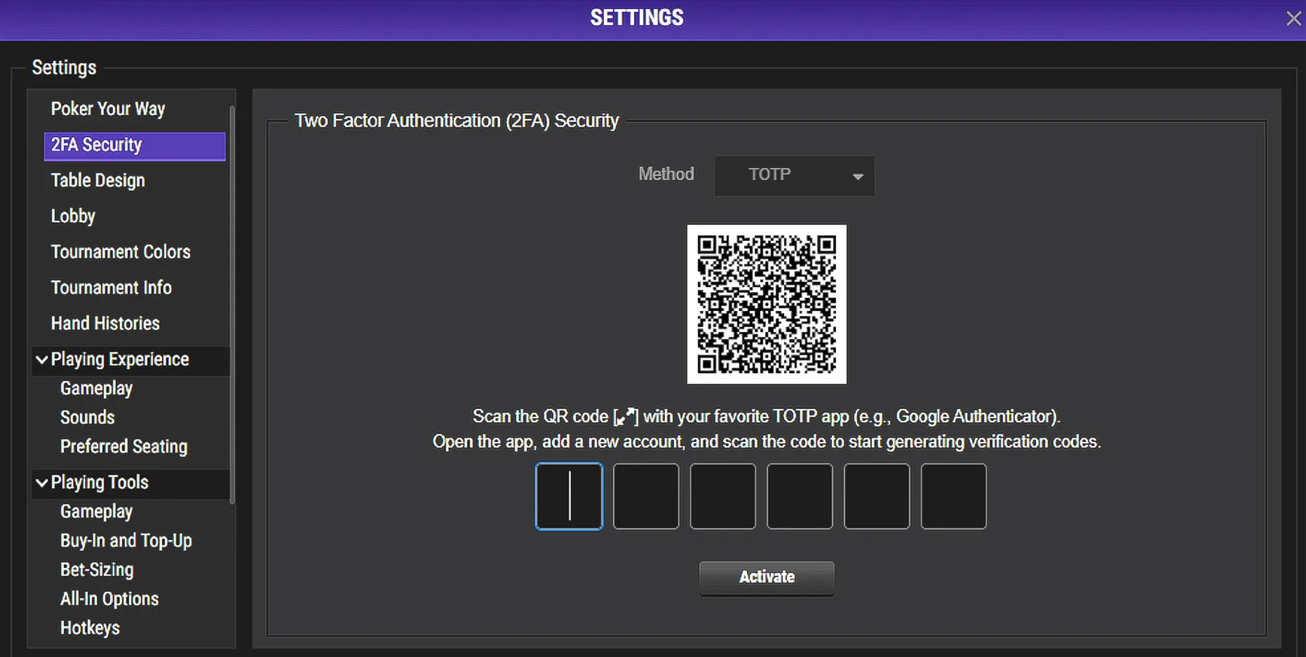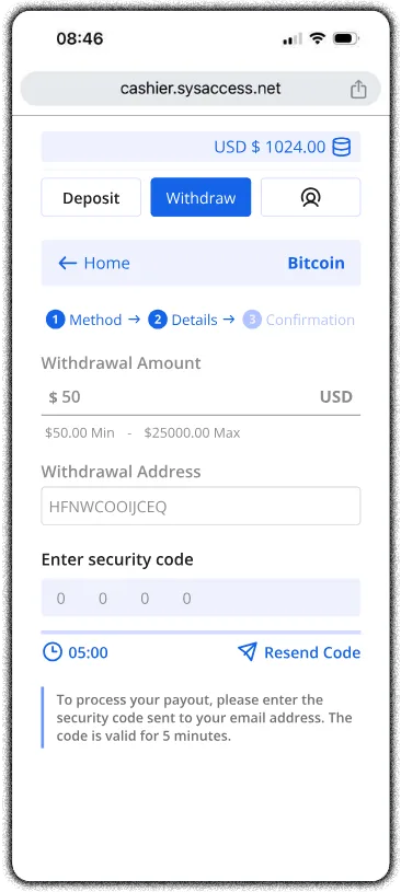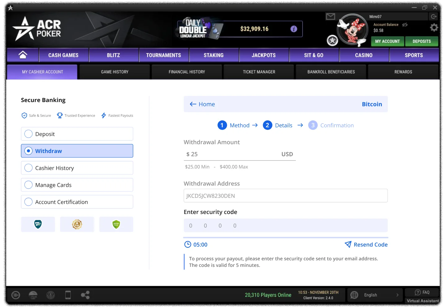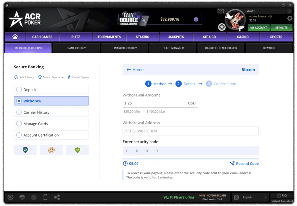 2-Factor Authentication for Payouts Home > Policies > 2-Factor Authentication for Payouts We’re pleased to introduce Email 2-Factor Authentication (2FA) on all payouts. This extra layer of security helps protect your funds and keep your ACR Poker account safe by confirming every withdrawal request through a unique code sent to your email. How Email 2-Factor Authentication Works for Withdrawals Step 1 – Request your withdrawalSubmit your withdrawal request as usual from the cashier section of the client.Right after that, check the email address registered to your ACR Poker account. You’ll receive a 4-digit verification code for Email 2FA.Step 2 – Enter your 4-digit codeAt the bottom of your screen, you’ll see a field asking you to enter the 4-digit code.Type in the code from your email and confirm your withdrawal. MOBILE VIEW: MOBILE VIEW: Important: Your 4-digit verification code expires in 5 minutes. If it expires, just request a new code by restarting the withdrawal process. Activating 2FA Security to Update Your Email Address If the email address on your account is old, incorrect, or no longer valid, you can update it directly from the poker client—but only if you have 2FA enabled.Step 1 – Open 2FA Security SettingsFrom the Settings menu in the client, click on “2FA Security.”Step 2 – Activate TOTPIn the 2FA Security area:From the dropdown menu, select “TOTP”.Click “Activate” to enable 2-Factor Authentication on your account.Scan the 2FA Security QR Code with your favorite TOTP app to start generating verification codes on your account.Enter the 6-digit code from your authenticator app and click “Activate”. Step 3 – Update Your Email in the Poker Client.Updating Your Email from the My Account SectionOnce TOTP 2FA is activated:Go to the My Account section.Click on “Account Information.”Find the “Email:” field.Click the pen/edit icon next to your email and add the New Email.Once you’ve added the new email, press CONTINUE.Retrieve the code from your email.Enter the code.After you enter the code, confirm your change of email using the one-time token from your Authenticator app.You will then be logged out. Log in again using your new email and your email will be successfully updated.Note: You must have 2-Factor Authentication activated on your account in order to update your email address.If you have any problems or need assistance with any of this process, please contact support@winningpokernetwork.com